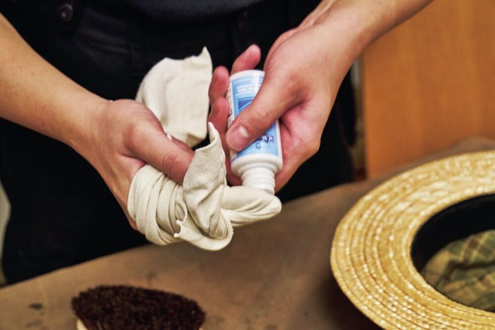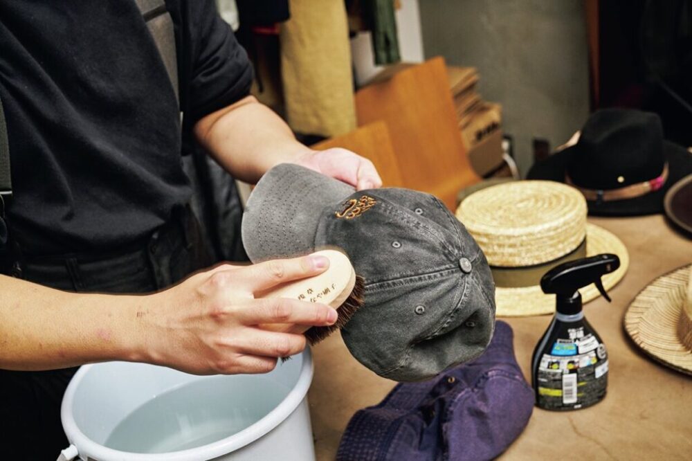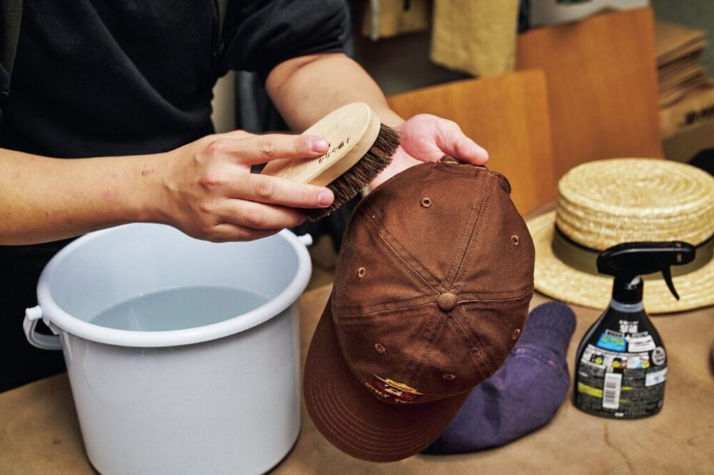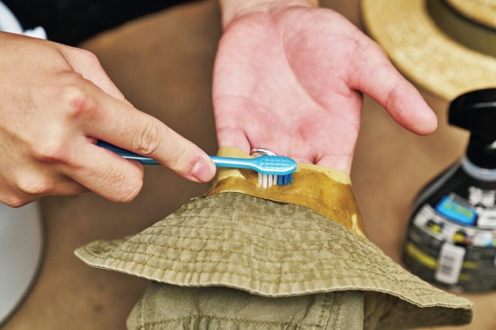まずはブラシで埃を落とします。スベリに汗染みや化粧品の汚れがひどい場合は、洗剤を汚れの部分に直接つけて歯ブラシで軽くこすります。その後は、帽子の中の芯が紙やプラスチックではないことを確認したうえでぬるま湯につけて洗い、固く絞ったら、タオルドライをして乾燥させます。