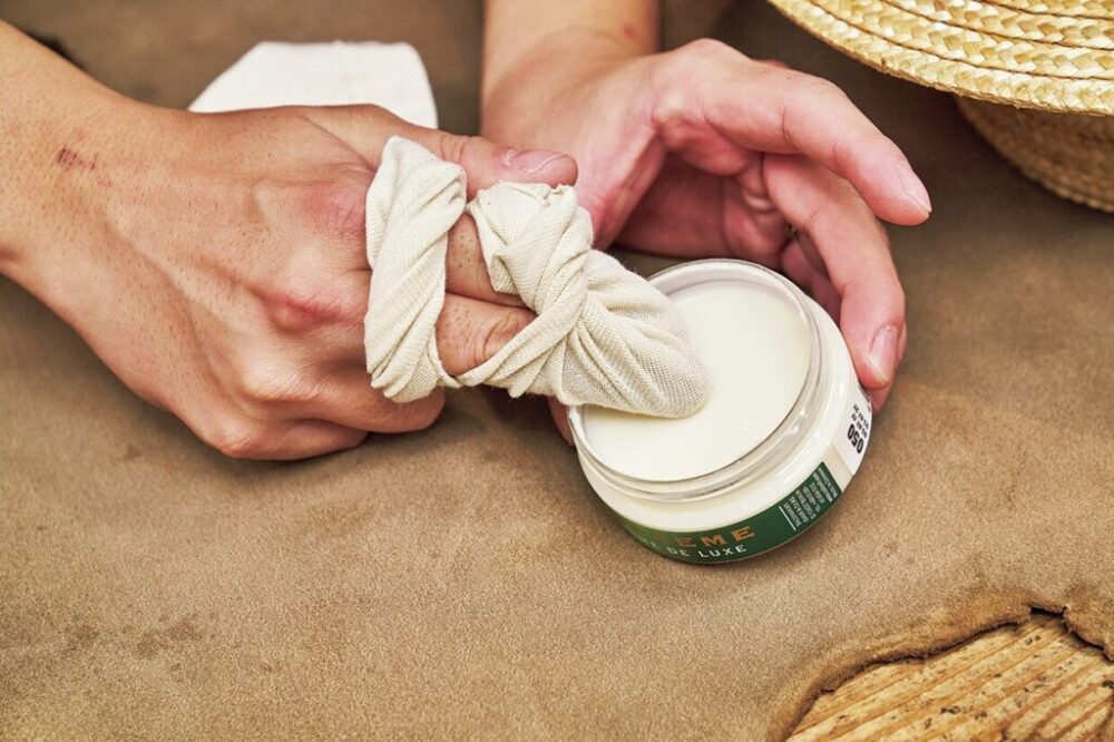 人差し指と中指に捻りながら巻きつけた布で靴用クリーナーをほんの少し取り、手の平で軽く叩いて布とクリーナーを馴染ませてから汚れを取ります。終わったら、今度は革用ケアクリームでも同様の手順で行います。肌に直接触れるスベリにクリーナーやクリームを塗ると、肌荒れが気になってしまうという方は、スベリに汗止めテープを貼っておくと良いです。1カ月に1回くらいの頻度で交換しましょう。