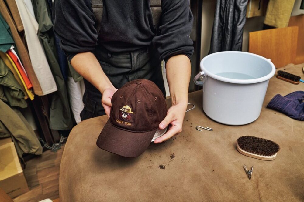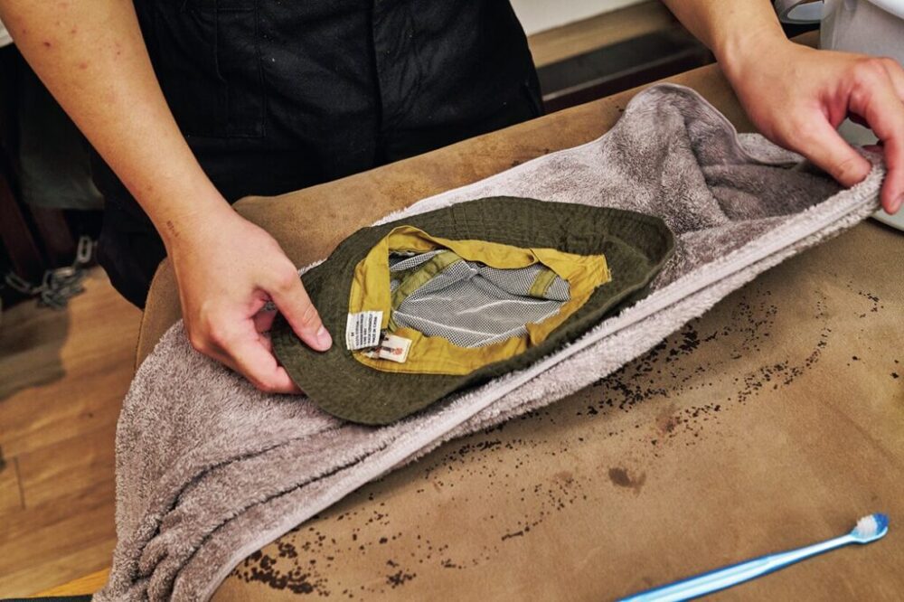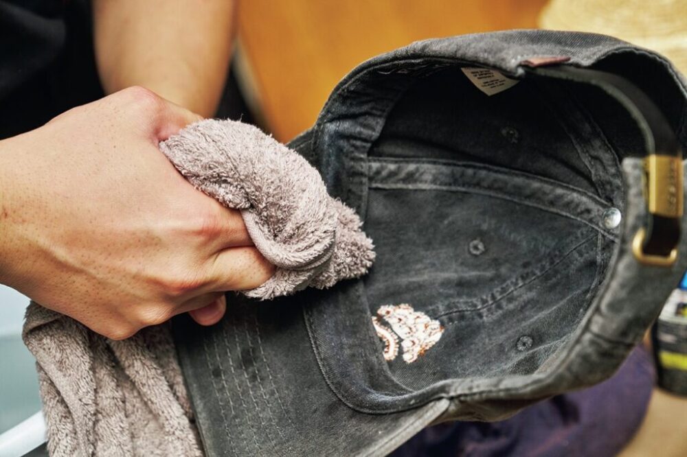 顔料染めやベルト部分が革のキャップは、手洗いできません。そのような場合は、まずブラシで埃を落とし、洗剤を入れた水で濡らして固く絞った布を指に巻きつけ、汚れを拭うように取っていきます。終わったら、風通りが良いようにスベリを開いた状態で乾燥させます。