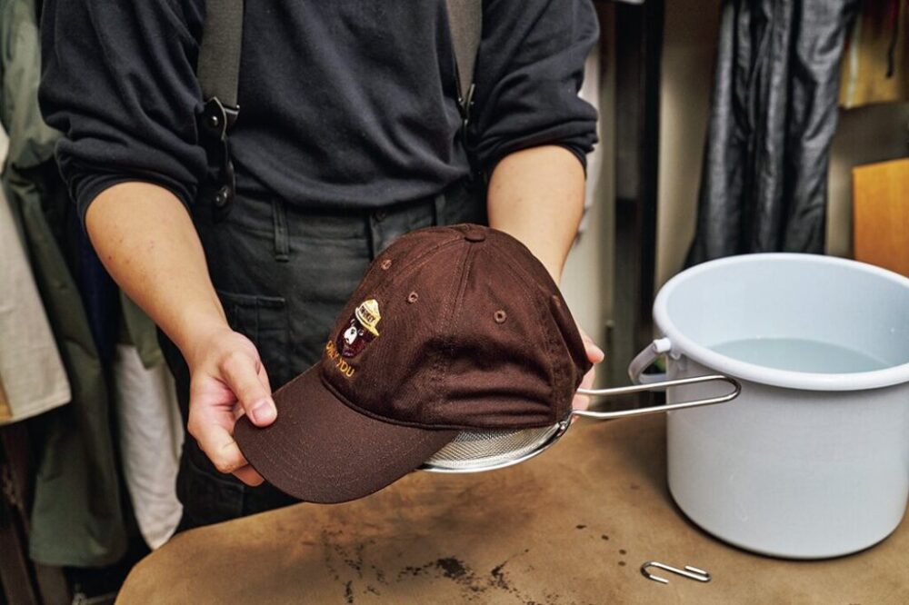 まずはブラシで埃を取ります。その後ぬるま湯の中で軽く動かすように、ふるい洗いをしたら絞ってタオルドライ。コットンキャップは絞りにくいので、タオルでしっかりと水分を取ってから干しましょう。型崩れが気になる場合は、ザルに被せて乾燥させます。内側に空気が入るので乾きやすいですよ。