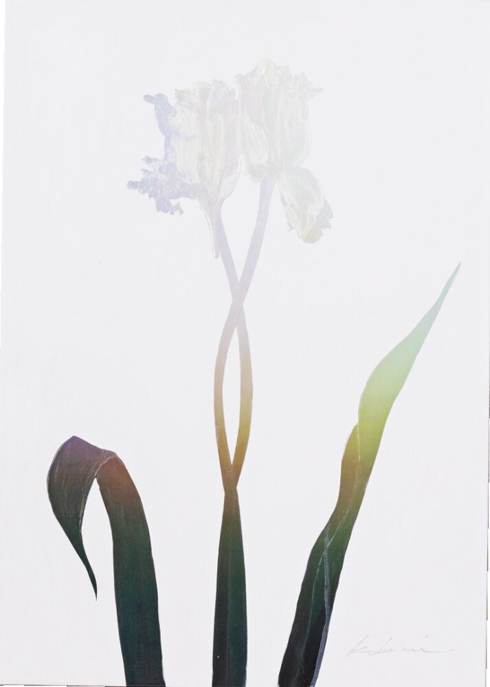 退職後は紆余曲折あって、雑誌にファッションイラストを寄せていたこともあります。でもやっぱりアートで表現をしてみたくって、2020年から今の名前で活動しています。ご指摘いただいたモノクロの作品が、自分としては初めて「作品と呼べる何かになったかも」と手応えを感じたものです。実はこの白色ってものすごく色んな色を混ぜた「白」なんです。トーンの低い白とでも言えばいいのかな。今年の頭の台湾での個展で、初めて「普通の白じゃないですね」と指摘を受けたのですが、海外の人にも伝わるのだと何だか嬉しかったです。アクリルで描いているんですけど、私にとって自然な色って「まだら」なんですよ。赤いチューリップひとつにしても、その赤にはグラデーションを感じると言いますか、色んな色の集合体だと感じています。