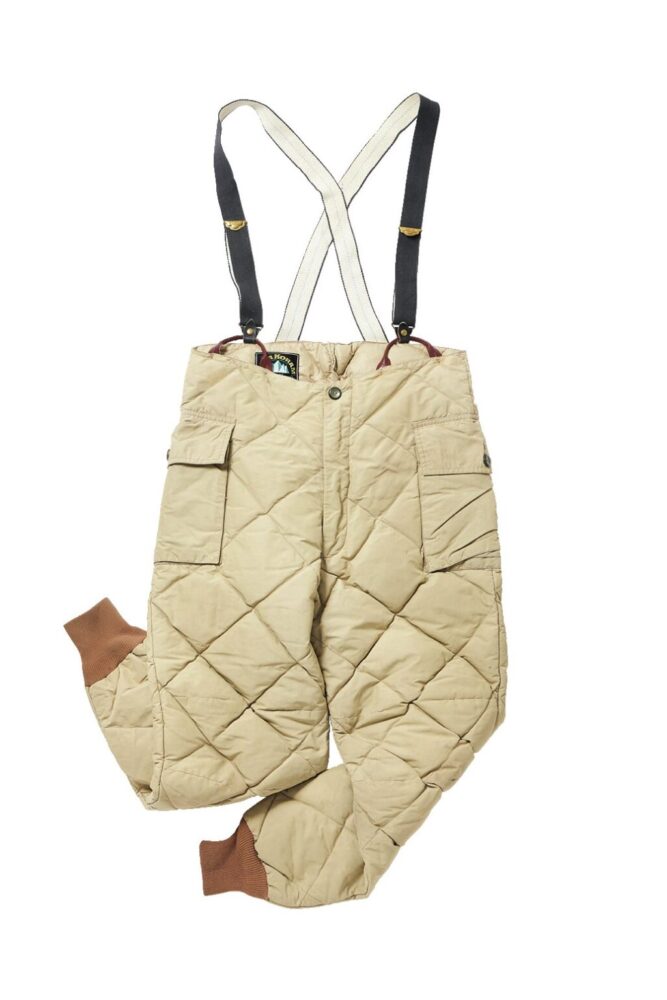 [カラコラム]とセットアップで着用できる60sのダウンパンツ。カラコラムタグが付き、カーゴポケットやサスペンダー仕様を備える。オーバーサイズで穿いても雰囲気が良い。3万円(コズミックジャンパー042-726-0610)
