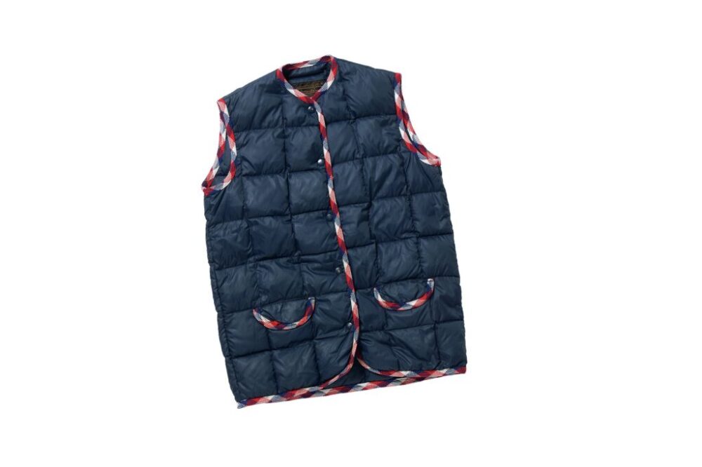 70sのウィメンズにのみ存在した[スリーブレスカーディガン]。詰まった襟にツイード調のテープパイピングが施されている。ゆったりとしたサイズ感で男性の着用も可能。1万5000円(コズミックジャンパー042-726-0610)