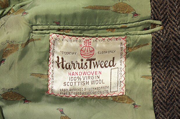 ハンティング用のレザー銃尾当てが両肩に施されたハリスツイードのカントリーコート。60s後期頃のタグは、山の形がピラミッドに見えることから白ピラミッドタグと呼ばれる。1万6500円(maar03-6383-2152)