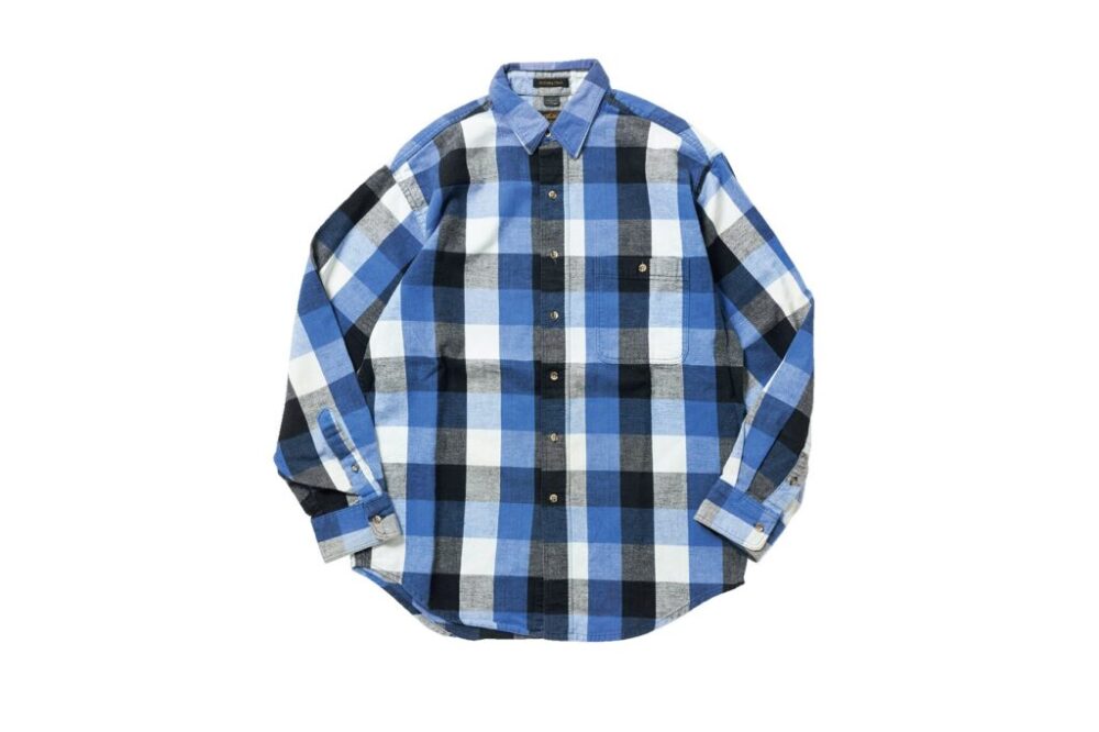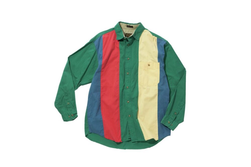 80s後期から90sの「エディー・バウアー」のシャツは、襟内側に生地名のタグが付く。こちらはラフトンツイル素材で、ボディ部分のツイル生地を大胆な切り替えが特徴。7700円(ドラセナ 吉祥寺本店0422-26-9366)