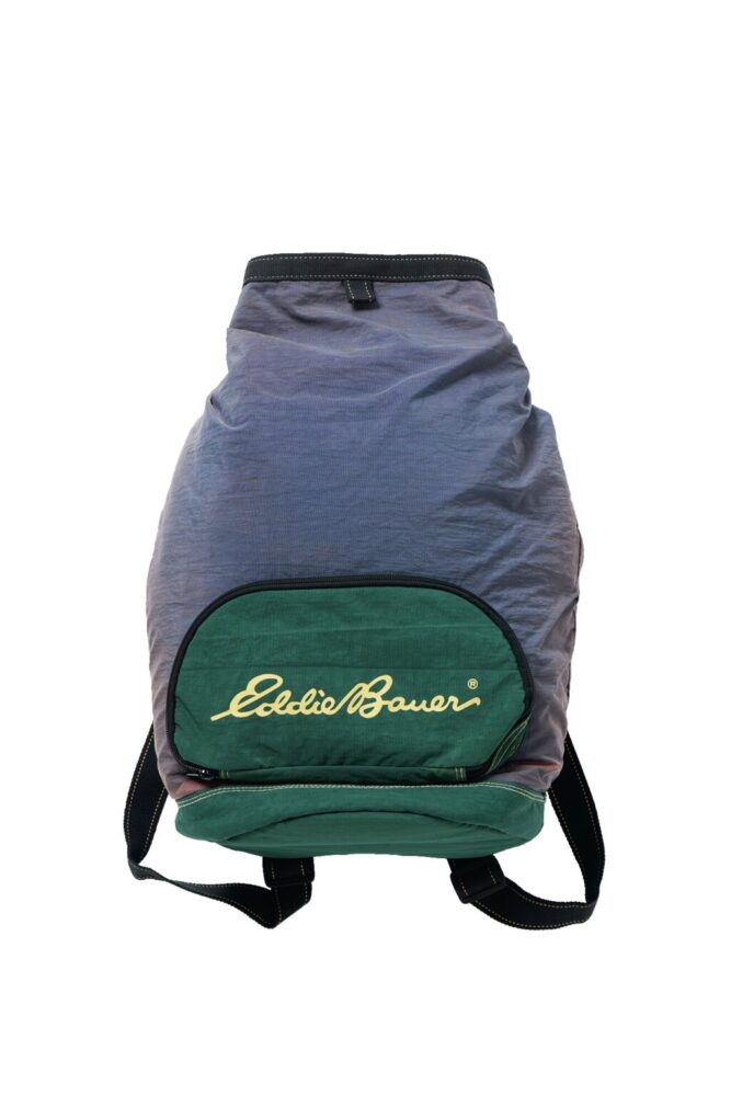 丸みのあるフロントポケットと大きなロゴプリント、グレー×グリーンの配色が可愛いバックパック。実はクーラーバッグとして作られたが、普段使いにもおすすめ。1万4300円(ファブリック 04-7166-1223)