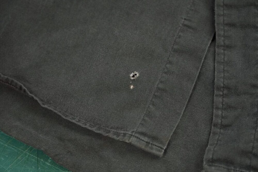 痛みによってできた穴なのか、小さいながらも色が抜けており、存在感のある小穴になってしまった。こうした場合は、シャツの生地から糸を取り、足し織り込むように直せば万事解決。