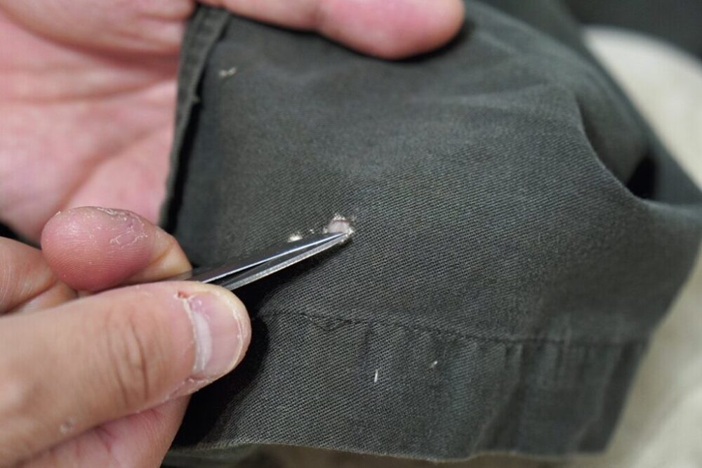 糸を足すために、シャツの前立ての裏など表からは見えない場所から糸を取る。対象が古着の場合綺麗すぎる糸は逆に目立つため注意が必要。