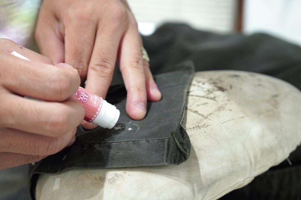 糸を足す際に固定のためスティック糊を塗っておくのがオススメ。ミシンでタタキ縫いをする時にミシンに押され糸がズレずることを防げる。