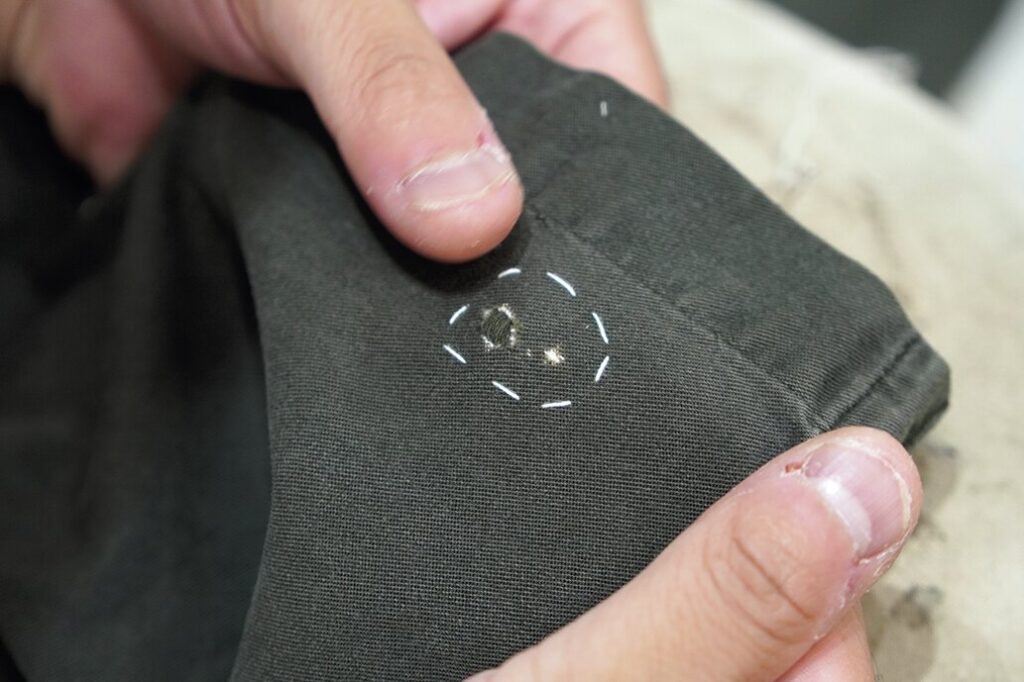 痛みによってできた穴なのか、小さいながらも色が抜けており、存在感のある小穴になってしまった。こうした場合は、シャツの生地から糸を取り、足し織り込むように直せば万事解決。