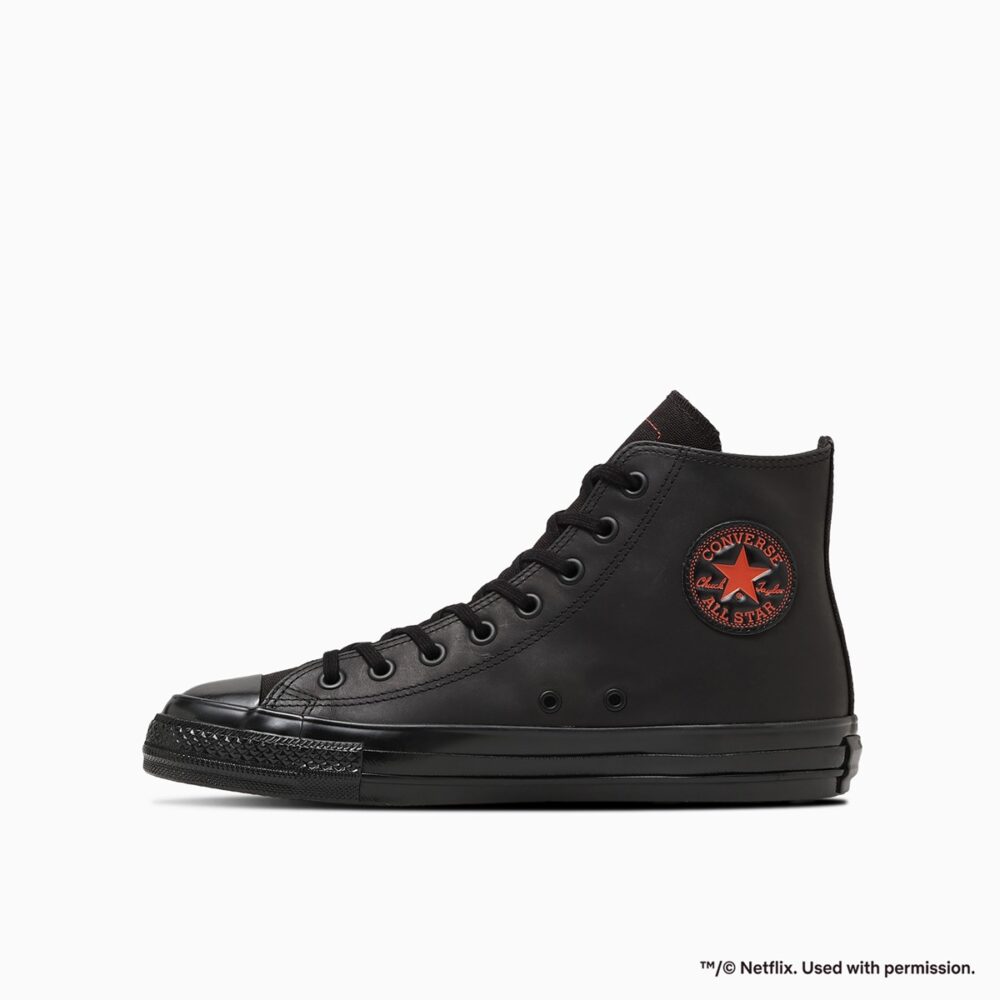 本モデルは、定番シリーズ「ALL STAR AGED(オールスター エイジド)」をベースに、ブラックを基調としながら、Netflixを象徴するレッドをアクセントとして随所に取り入れた一足だ。外腰にはNetflixロゴを刺しゅうで配置し、タン裏にはプロフィールアイコンとしておなじみのスマイルマークラベルをデザイン。ファン心をくすぐるディテールを随所に盛り込んでいる。さらに、アッパーにはレッドステッチを効かせ、さりげないアクセントをプラスした。
