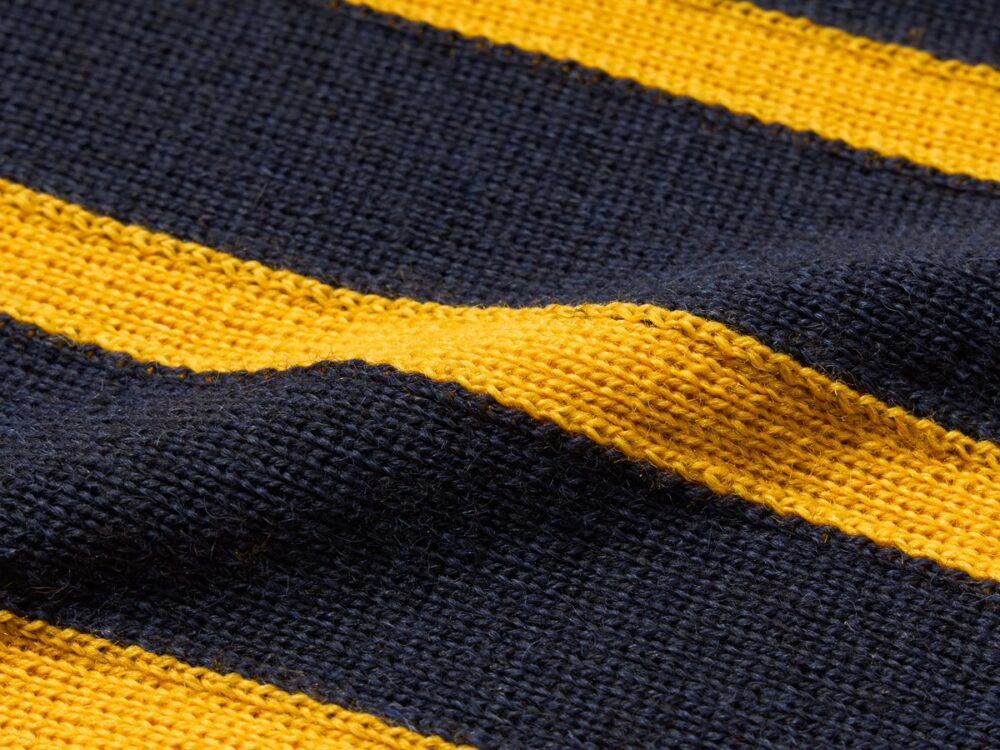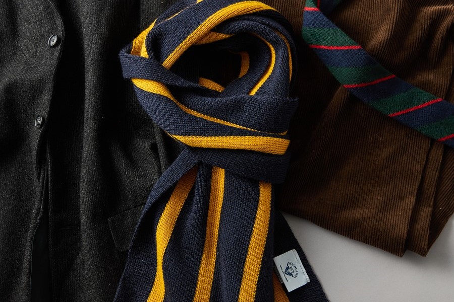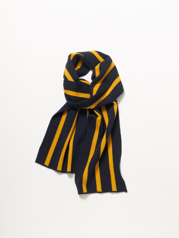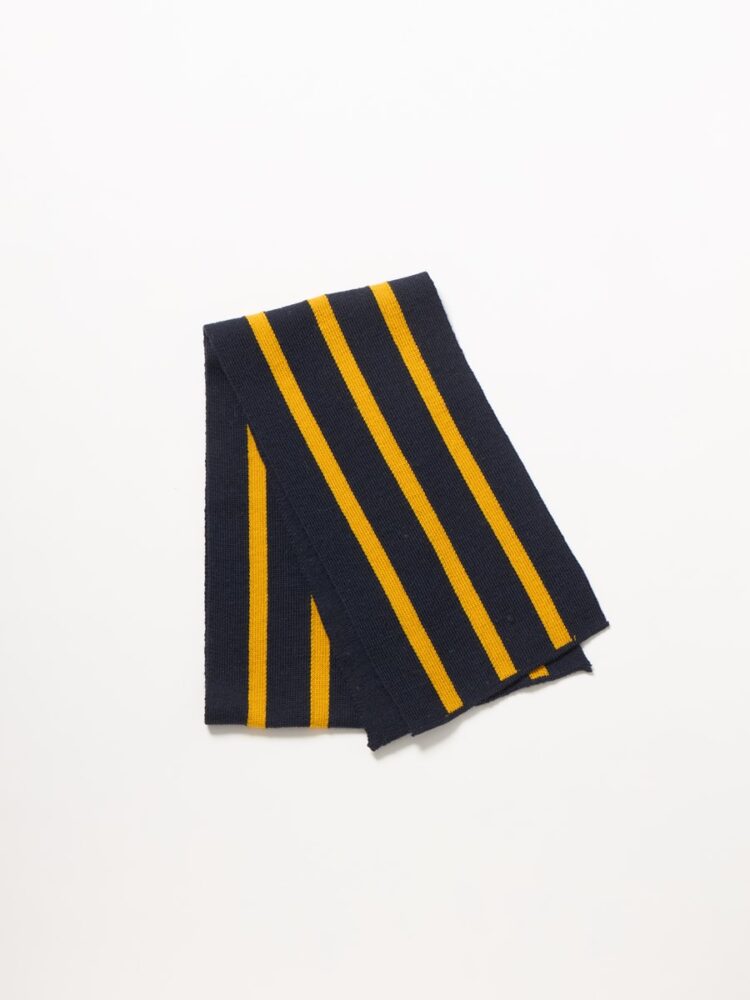 デザインのベースは、ヴィンテージのスクールマフラーに多く見られる、スクールカラーを用いた2色使いのストライプ。紺ブレを思わせる深みのあるネイビーに、アクセントとして効かせたイエローが、トラッドスタイルによく映えます。