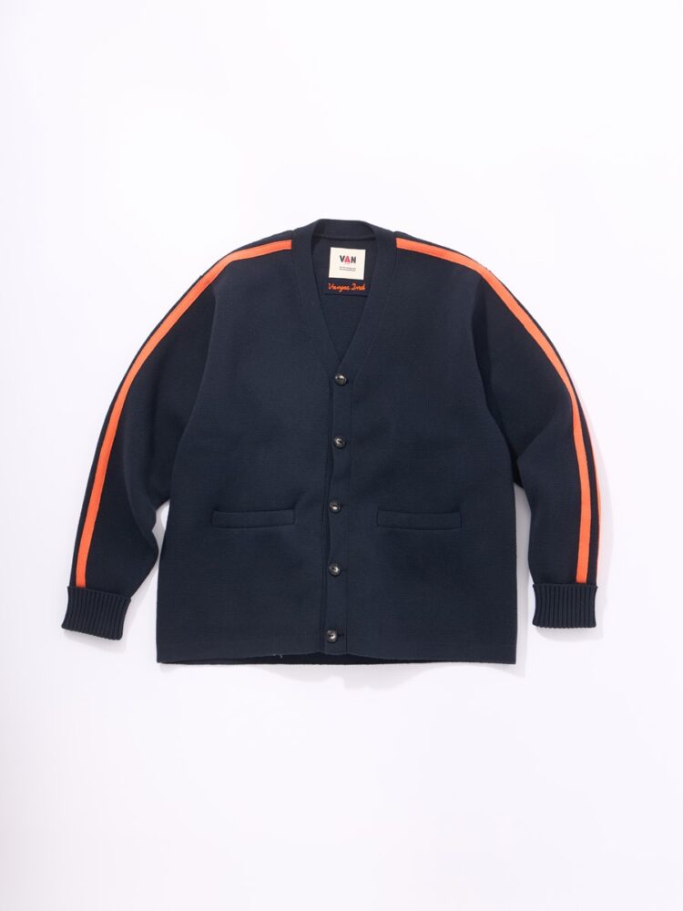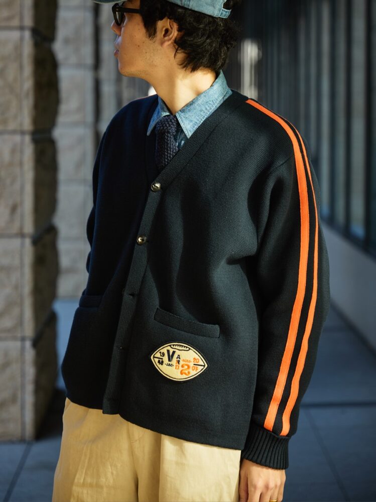 日本にアイビーの礎を築いたブランド、「VAN(ヴァン)」とのコラボがついに実現。あえてブレザーやBDシャツなどではなく、すこしマニアックだけどVANらしいアイビー感をしっかりと演出できるレタードカーディガンを製作。トラックジャケットのようなラインが入った袖や、ブラック×オレンジのカラーリングなどは、王道からは少し離れたモダンな印象の“ネオアイビー”な1着となっている。
