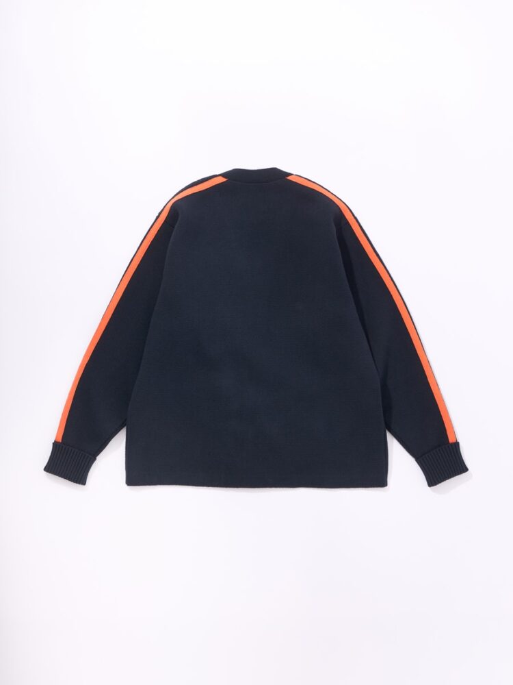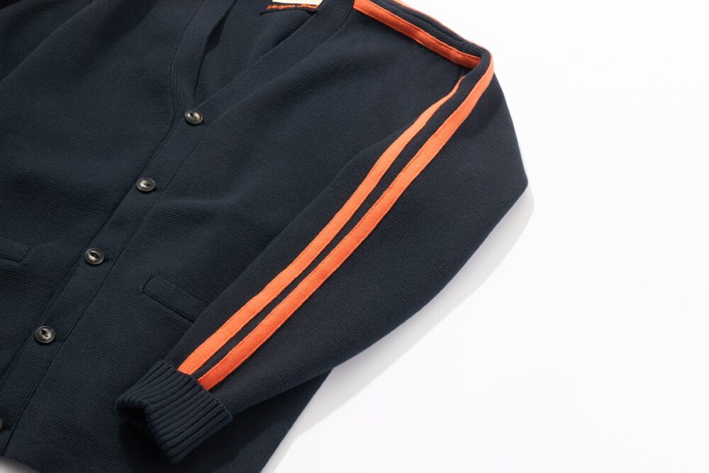 通常のレタードカーディガンにはあまり見られない、肩から袖先まで走る2本のラインも大きな特徴のひとつ。「トラックジャケット」に多いデザインだが、レタードカーディガンとの相性の良さから採用した。こういった“ハズし”となるディテールによって、単なるクラシックとはひと味違うモダンな印象に仕上がっている。