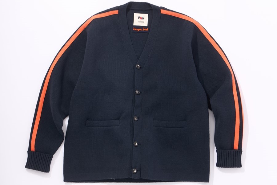 日本にアイビーの礎を築いたブランド、「VAN(ヴァン)」とのコラボがついに実現。あえてブレザーやBDシャツなどではなく、すこしマニアックだけどVANらしいアイビー感をしっかりと演出できるレタードカーディガンを製作。トラックジャケットのようなラインが入った袖や、ブラック×オレンジのカラーリングなどは、王道からは少し離れたモダンな印象の“ネオアイビー”な1着となっている。