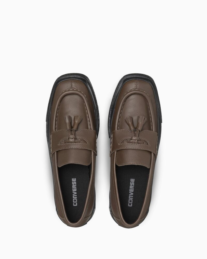 本モデルは、コンバースを象徴するオールスターをベースに、スクエアトウのレザーシューズから着想を得たデザインを組み合わせた一足。取り外し可能なタッセルパーツを備え、タッセルローファーとしても、タッセルを外したコインローファー調の表情でも着用できる2WAY仕様となっている。