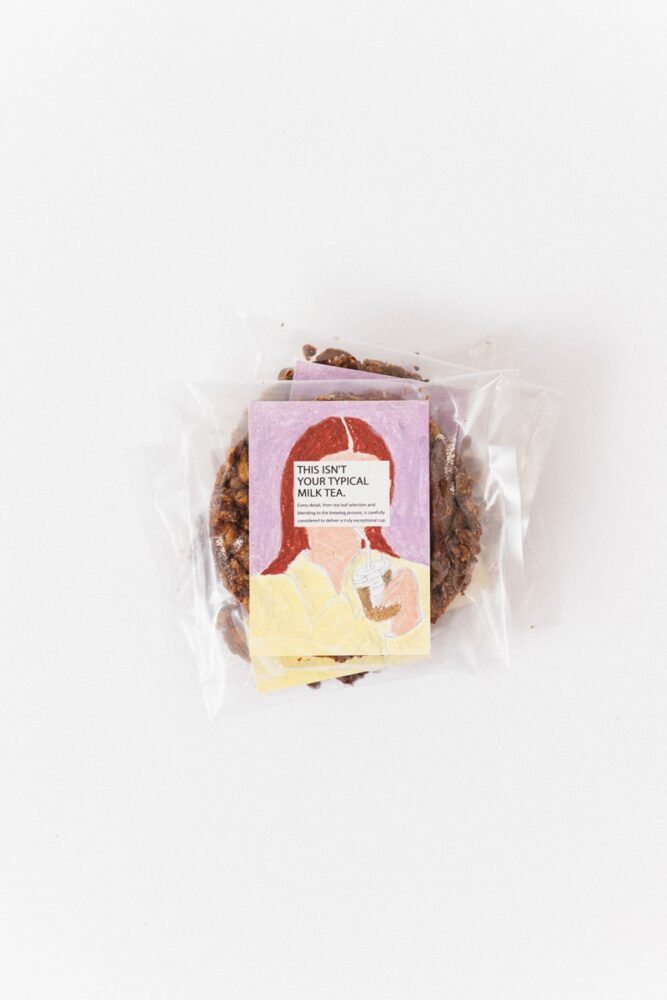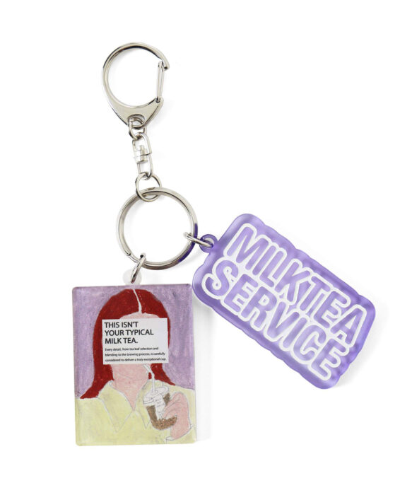 描き下ろしアート2点と「MILK TEA SERVICE」ロゴを組み合わせた特別仕様。バッグや鍵に付けることで、ミルクティーを楽しむ穏やかな空気感を持ち運べる。