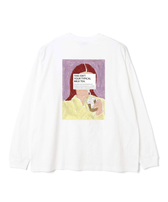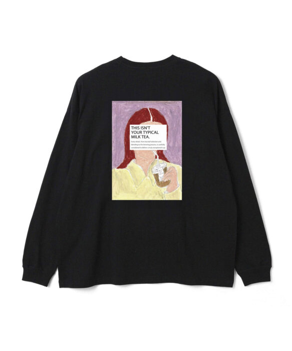 ミルクティーを味わう人物を描いたアートを背面に配置。胸元には「MILK TEA SERVICE」のロゴを立体刺繍であしらい、シンプルながら表情のある一着に。適度な厚みのある生地とリラックス感のあるシルエットで、性別を問わず着用できる。