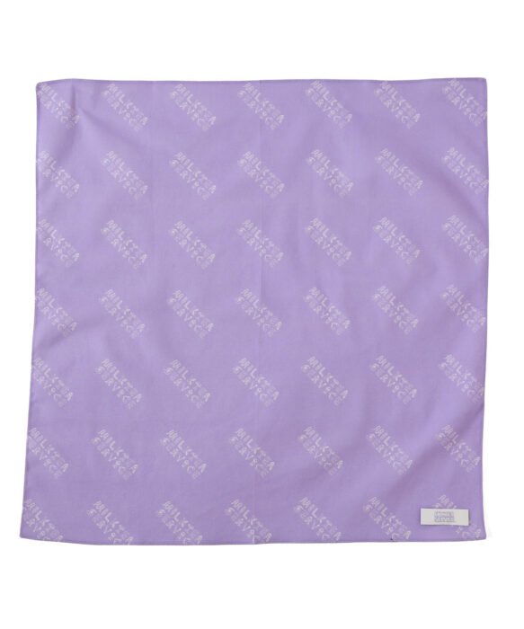 ミルクティーにまつわるモチーフを散りばめた総柄と、制作工程をアルファベットで表現した2種を展開。53cm角のコットン100%素材で、ハンカチやバッグのアクセントなど自由な使い方が楽しめる。