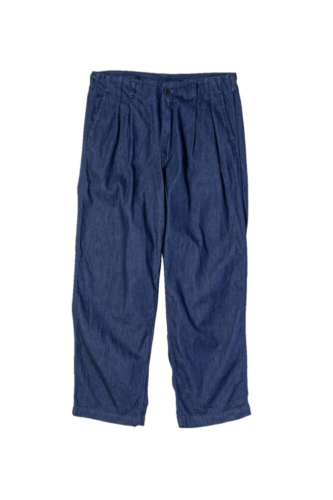 2プリーツとテーパードが特徴の[カリフォルニアペグトップ]。バックポケットには、ダブルウエルトポケットを採用。3万7400円(ポストオーバーオールズ中目黒TEL03-6303-2160)