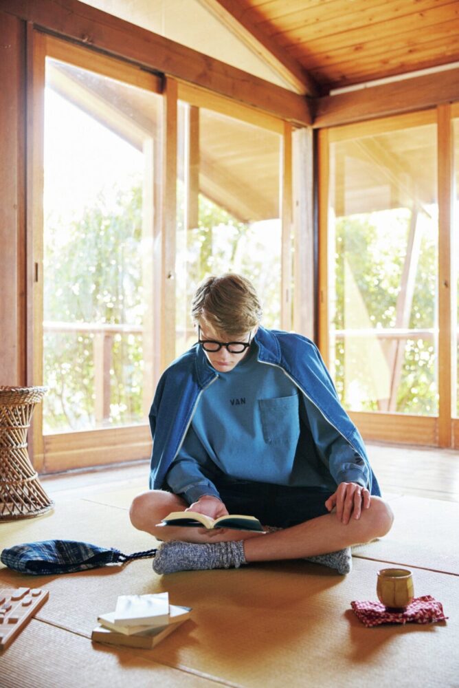 スタンドジップアップスウェット3万5750円、インディゴ長袖Tシャツ2万350円、ショーツ2万3100円/すべてヴァン(ヴァンヂャケットTEL03-5829-9005)、メガネ4万9500円/ジュリアス・タート・オプティカル(G.B.ガファスTEL03-6427-6989)ソックスはスタイリスト私物