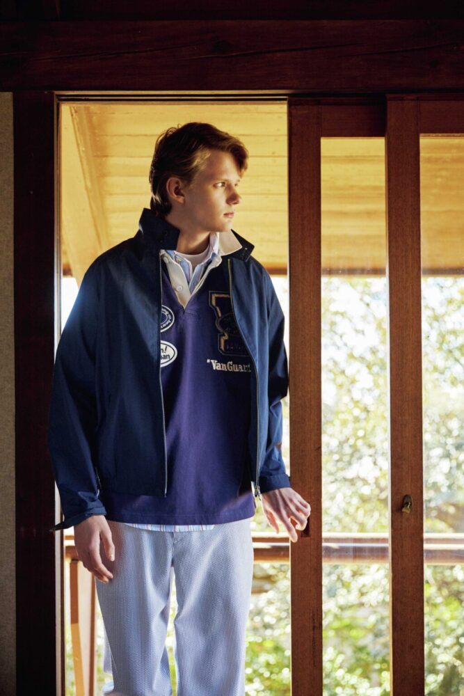 アイビーらしいカスタムを配したラガーシャツと、サッカーパンツの相性は抜群。全身ブルーのコーデを、同じくネイビーのスウィングトップでまとめあげる。スウィングトップ3万9600円、ラガーシャツ2万7500円、中に着たBDシャツ1万8150円、イージーサッカーパンツ3万1900円/すべてヴァン