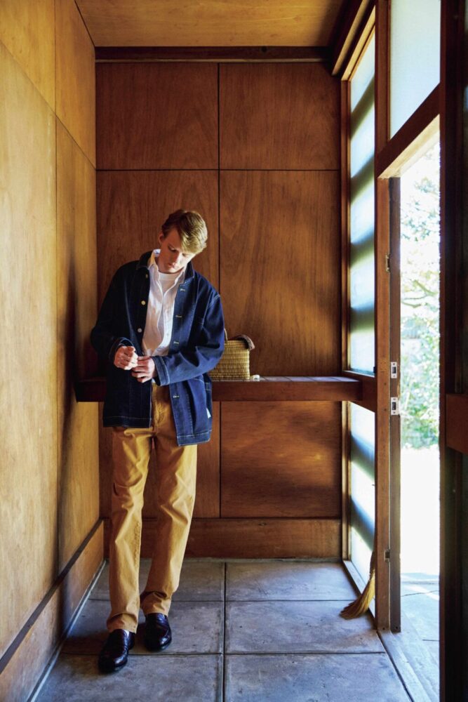 トラディショナルなブルーの筆頭であるデニム。安心感のある王道の合わせだが、実はチノパンツはストレッチ性を備えるなど、現代ならではの機能性も担保。デニムカバーオール4万4000円、BDシャツ1万9800円、中に着たTシャツ1万3750円、チノパンツ3万5200円/すべてヴァン