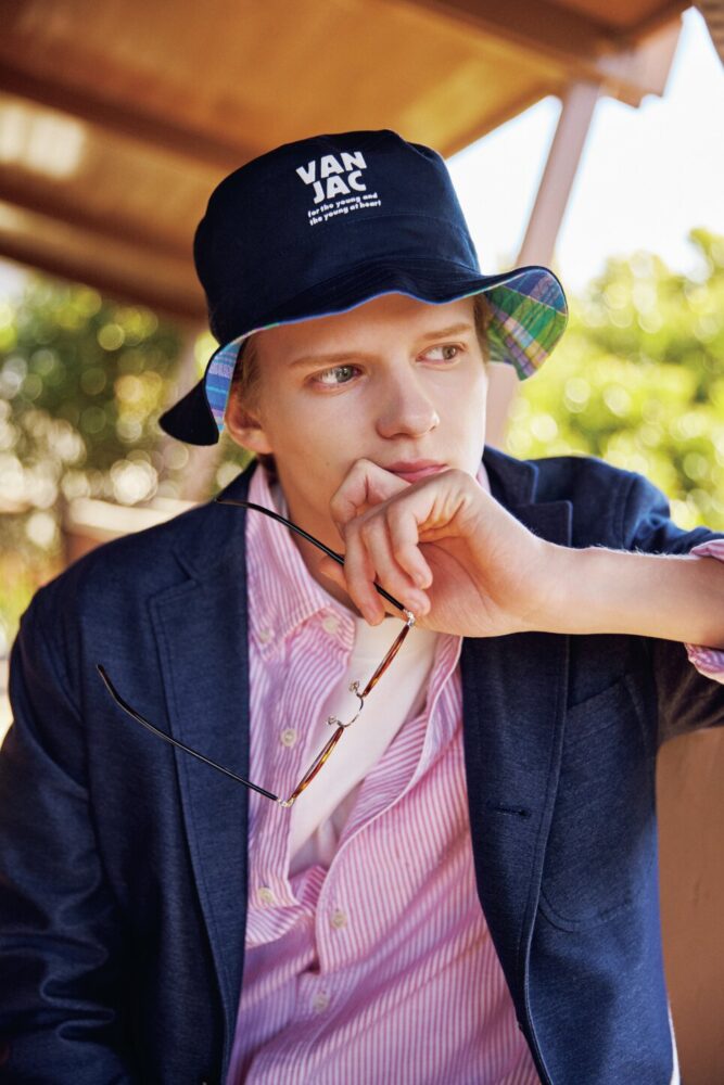 マドラスチェックが覗くバケットハットはリバーシブル仕様。ジャケットも、デニムに見えて伸縮性のある快適な素材感。いずれも見た目と意外な機能性を両立する。デニム調ジャケット4万9500円、BDシャツ1万9800円、リバーシブルハット1万560円/すべてヴァン、手に持ったメガネ2万3100円/エイチフュージョン(G.B.ガファスTEL03-6427-6989)