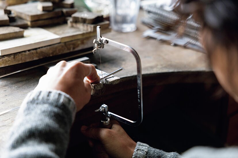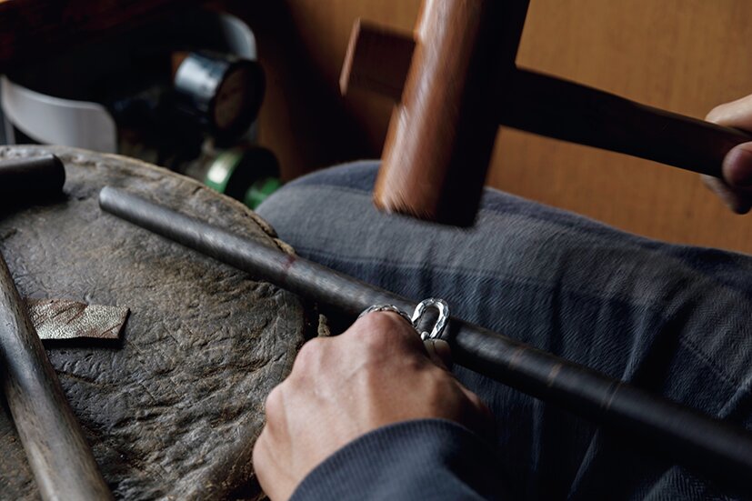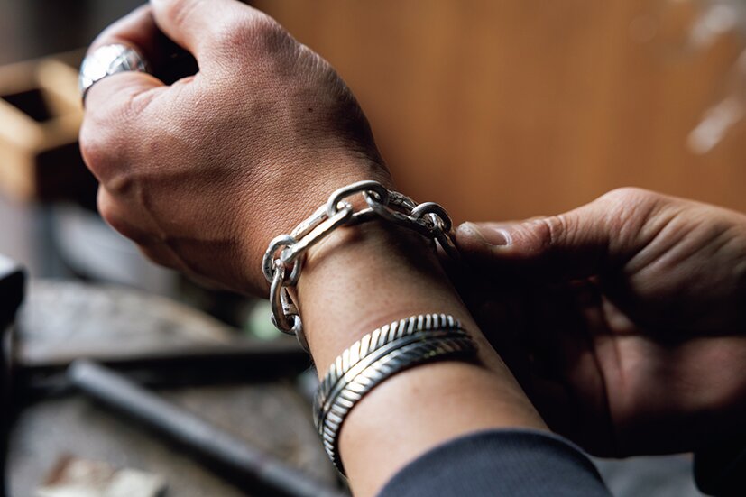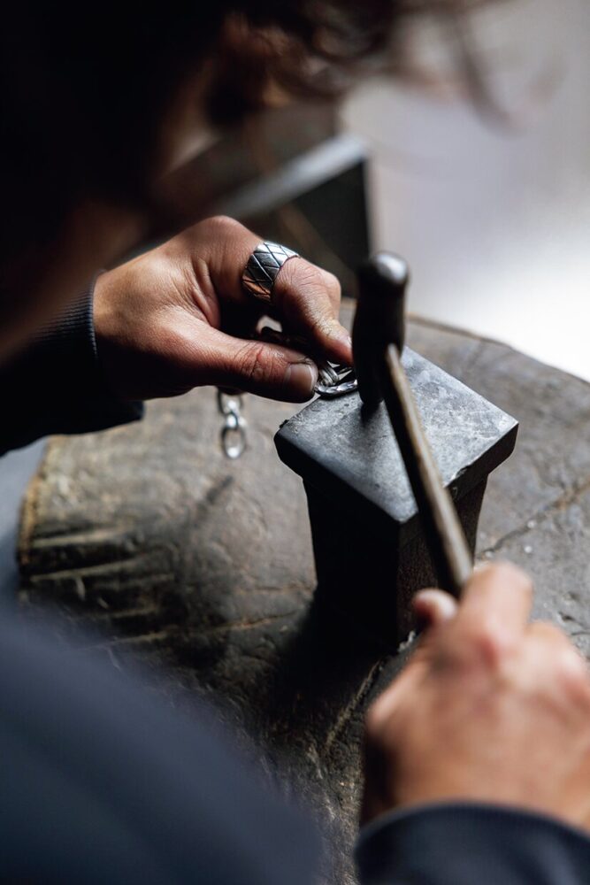 シルバーの丸線を適切な長さでカットし、金槌で叩いてニュアンスをつけるところから製作は始まる。すべてのパーツを木槌で叩き丸め、先にすべてを組み合わせて1本のチェーン上にし、金槌で細かく叩いて「市松」の象徴でもある凹凸を付けていく。最後に手首に沿うよう木槌で叩き湾曲させて完成。これだけ聞くとシンプルに思えるが、一つひとつの工程は繊細で、丁寧に時間をかけて制作される。