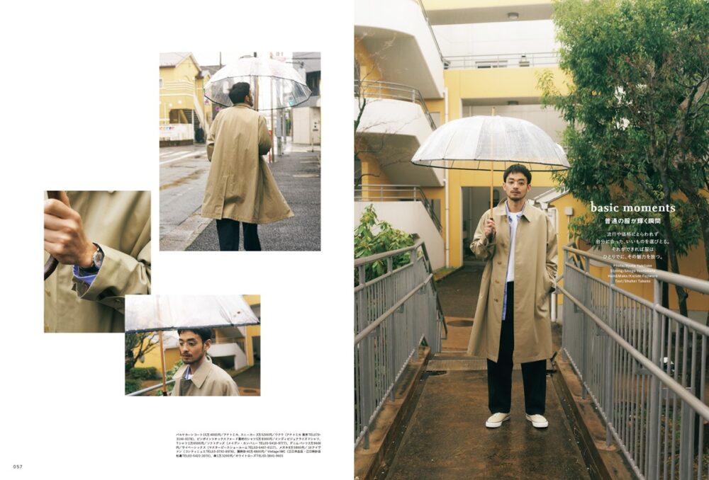 価格や流行など、すぐに移り変わるものに流されることなく、自分に合ったいいものを選びとる。そうすることで、服はおのずとその魅力を輝かせるはずです。ここでコーディネイトしているアイテムは〈ブルックス ブラザーズ〉のオックスフォードBDのような往年の名作もあれば、〈サイ ベーシックス〉、〈ディスイズアセーター〉のような現代的ベーシックブランドの服も取り入れています。それらが、輝いて見える瞬間を表現したグラビアページです。