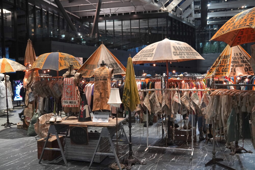 ヴィンテージのパラソルと大量のエプロンバック、とにかく大迫力な「ティッピラグ」。ここまで同じ種類のアイテムを吟味しながら買うことは今後ないかも⁉︎ 要チェックです!