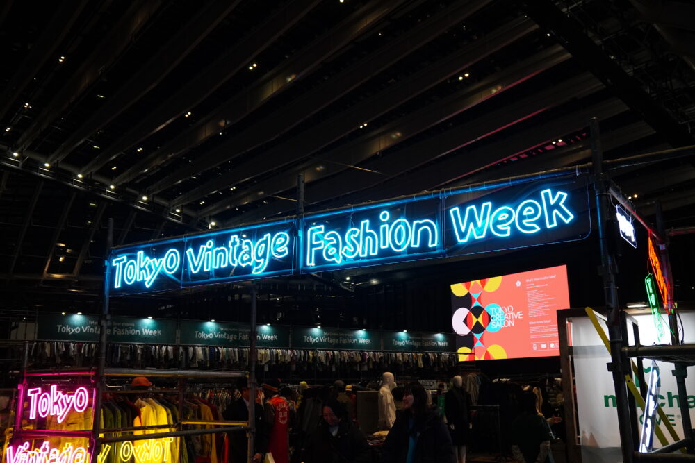「Tokyo Vintage Fashion Week」のネオン管ゲートをくぐった瞬間、目の前に広がるのは圧巻のヴィンテージマーケット!