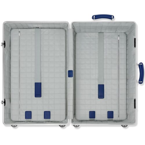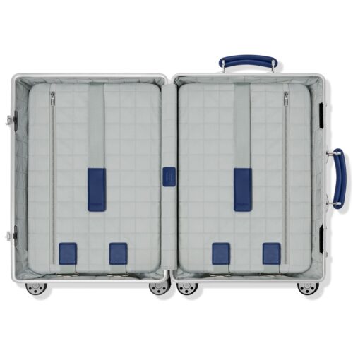 ブルーのレザーアクセントは、RIMOWAの歴史的カラーへのオマージュとして採用され、全体のデザインに洗練された個性を加えている。また、アーカイブロゴを配したラゲージタグや限定ナンバー入りバッジなど、特別仕様の付属パーツも用意される。