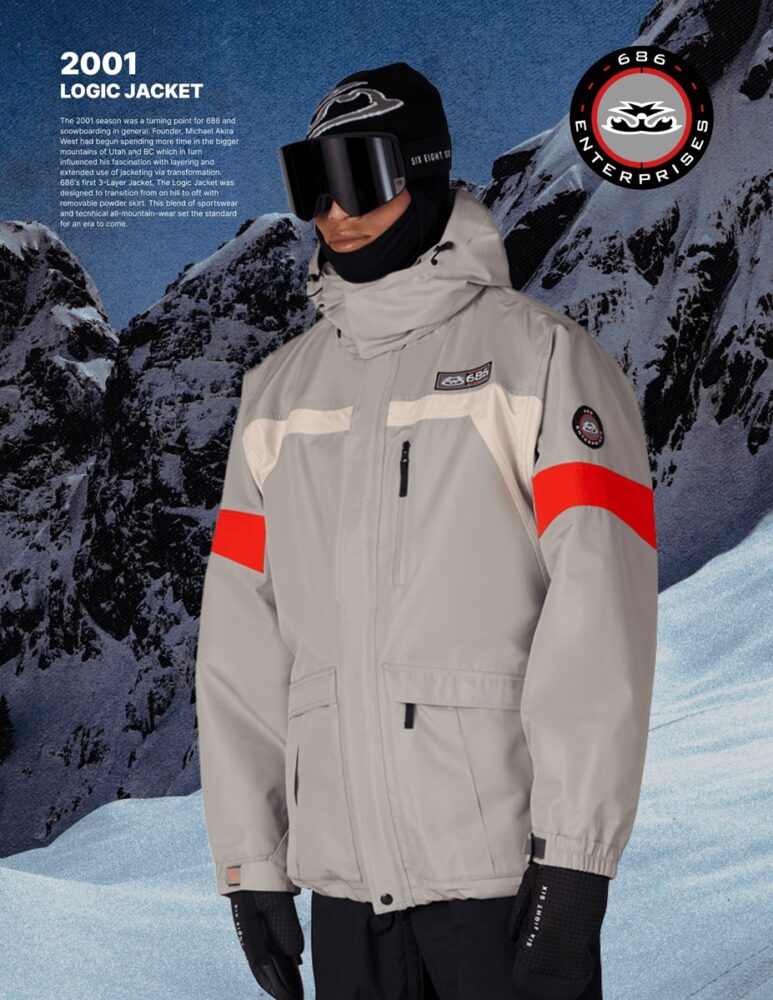 2001年シーズンは、686とスノーボーディングにとって大きな転換点となった時代である。その象徴的なプロダクトがこの「LOGIC JACKET」である。創設者マイケル・アキラ・ウエストが、ユタやブラッコムのビッグマウンテンでのライディングから着想を得て生み出した一着で、レイヤリングや可変性という当時としては革新的な思想が反映されている。スポーツウェアとテクニカルアウターを融合させたデザインは、その後の686の方向性を決定づけた。