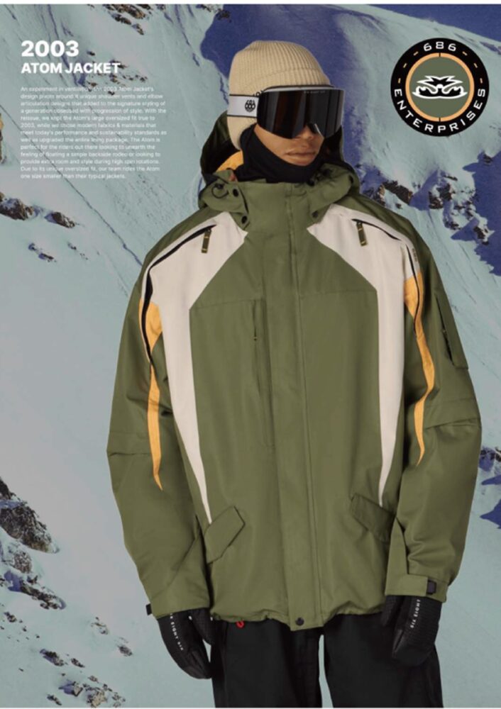2003年に登場したATOM JACKETは、686がデザインと機能の両面で新しい表現に挑戦していた時代を象徴する一着である。ショルダーやアーム周りに配置された独自のベンチレーション構造と立体的なエルボーデザインは、当時の“スタイルの進化”を追い求めるライダーたちの感性を色濃く反映している。HERITAGE COLLECTIONとして復刻された本モデルは、オリジナルのオーバーサイズシルエットを忠実に再現しながら、素材やライニングを現代仕様にアップデートしている。