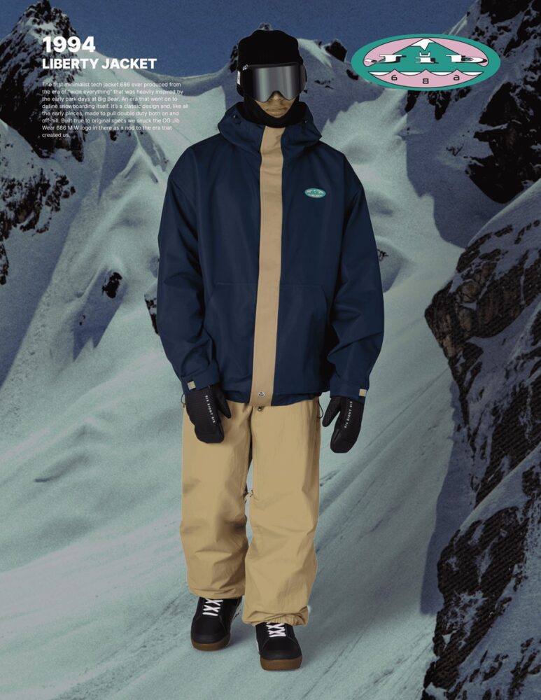 1994年、686が初めて手がけたミニマルなテックジャケットがこのLIBERTY JACKETである。すべてがワイドだった時代、ビッグベアでの初期パークシーンからインスピレーションを受けて生まれた一着である。オンヒルとオフヒルを行き来する当時のライディングスタイルに合わせ、シンプルでありながら機能的な設計が、後のスノーボードウェアの在り方を形作った。HERITAGE COLLECTIONでは、当時のスペックとデザインを忠実に再現しつつ、686の原点を象徴するOG Jib Wear 686 MWロゴをさりげなく配置している。