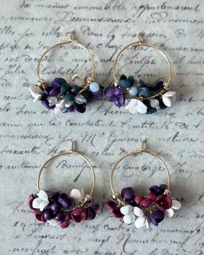 本物の花から作ったアクセサリー。市場の花材を自社加工し、ドライフラワーのリースやスワッグを制作するブランド。余った花材をアクセサリーに生かし、ロスフラワーゼロを目指してアップサイクルに取り組んでいる。
