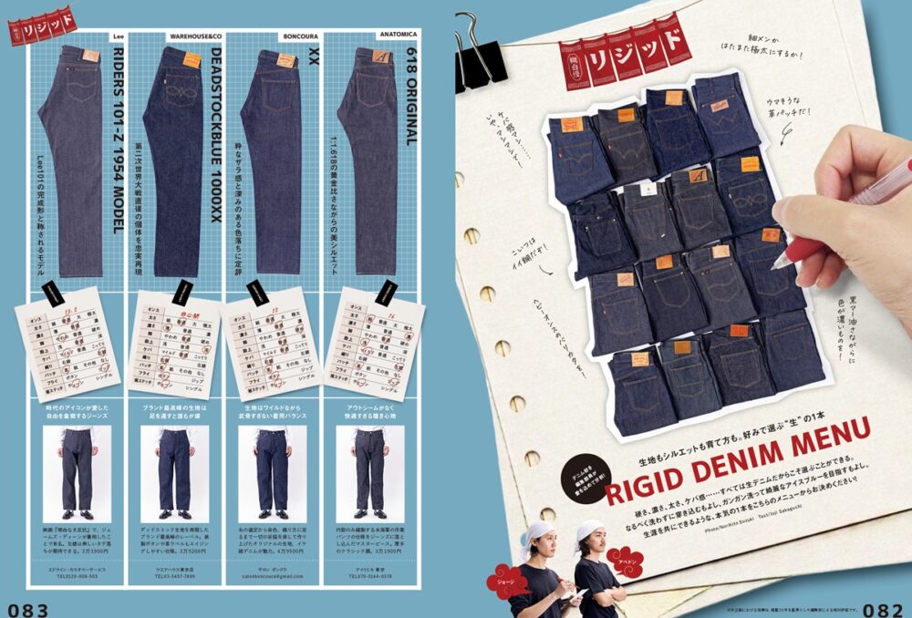 硬さ、濃さ、太さ、ケバ感——リジッドデニムは、これらの要素を自分好みで選べるのが魅力です。本企画では、各モデルの個性を整理し、ラーメンのオーダーのように比較しやすい形でご紹介しています。洗わずに穿き込み、メリハリのある色落ちを楽しむことも、洗いを重ねて鮮やかなアイスブルーに育てるのもあなた次第。選び方も育て方も自由なリジッドデニムの魅力と自分好みな1本を、このカタログからぜひ見つけてください。