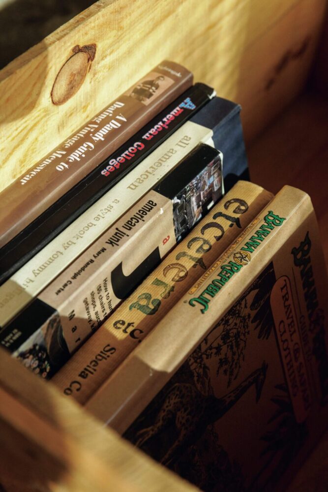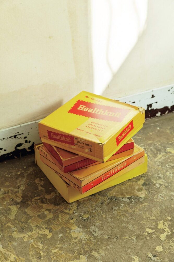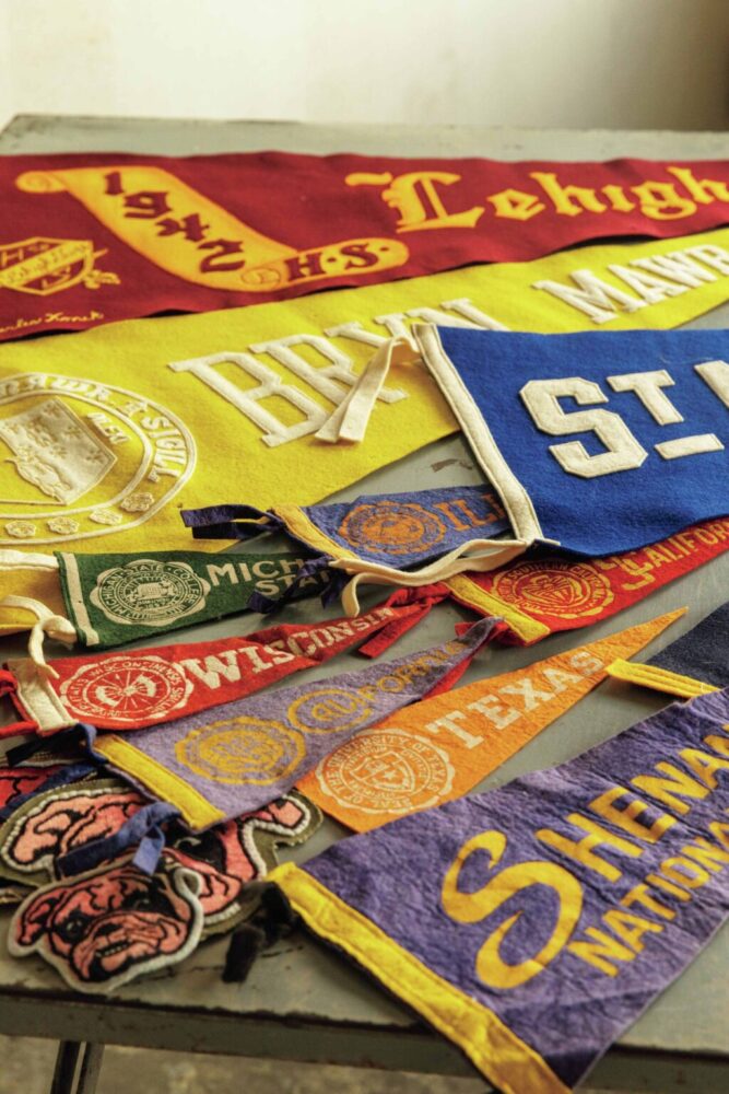 また、様々なブランドのルックブックやヴィンテージTシャツのボックスパック、アメリカの伝統校であるアイビーリーグなどのカレッジアイテムを中心とした膨大な数のペナントなど、彼の琴線に触れ、蒐集してきたモノの数々が、ライディングハイの輪郭を形成している。