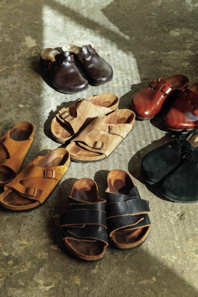 ヴィンテージの杢のTシャツやプリントスウェット、長年にわたって愛用している、解剖学に基づいた独自のフットベッド(インソール)を特徴とし、デザイン性と機能性を両立する「ビルケンシュトック」のフットウエアもモノづくりに小さくない影響を与えている。
