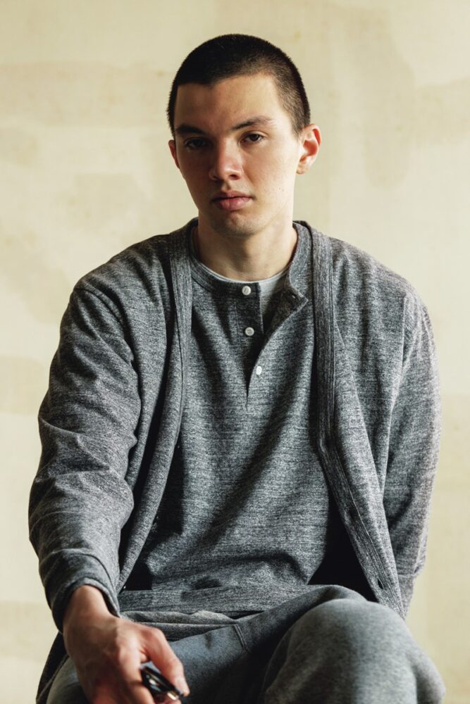カーディガン1万3200円、ヘンリーネックTシャツ1万670円、中に着たTシャツ8140円、スウェットパンツ2万7500円/すべてライディングハイ、スニーカー/スタッフ私物