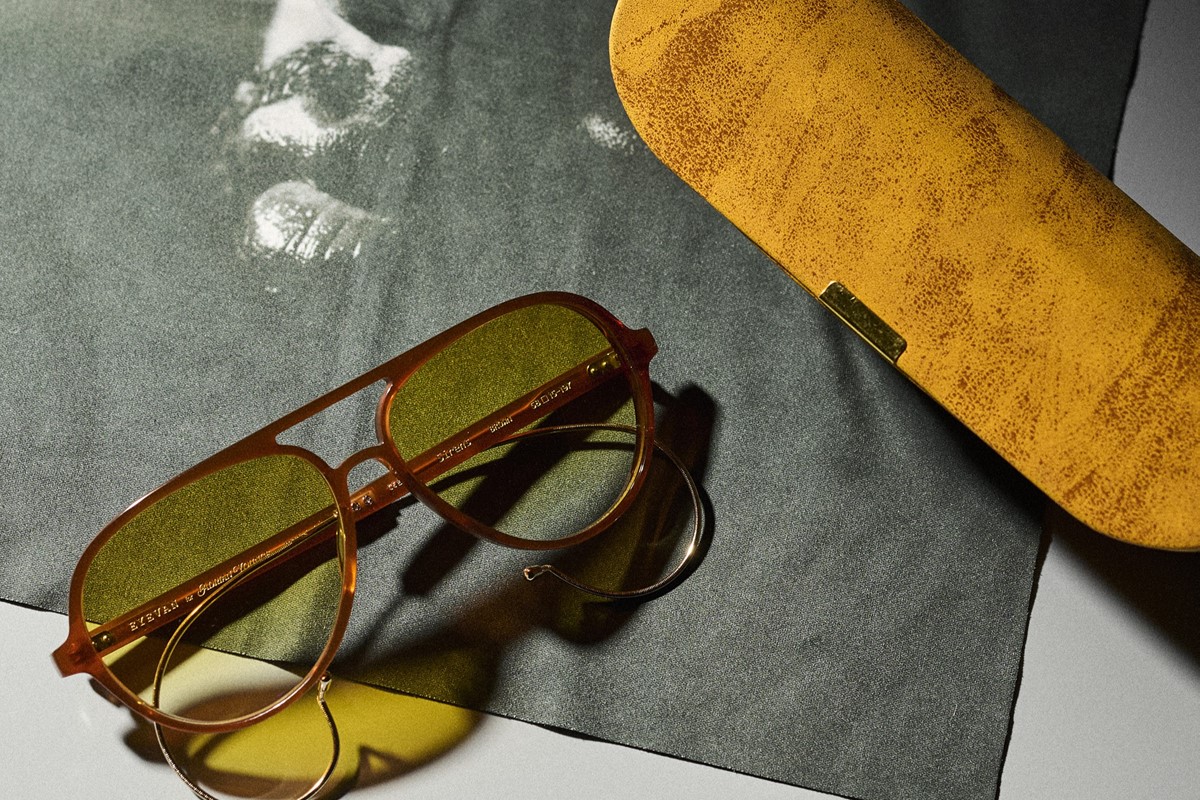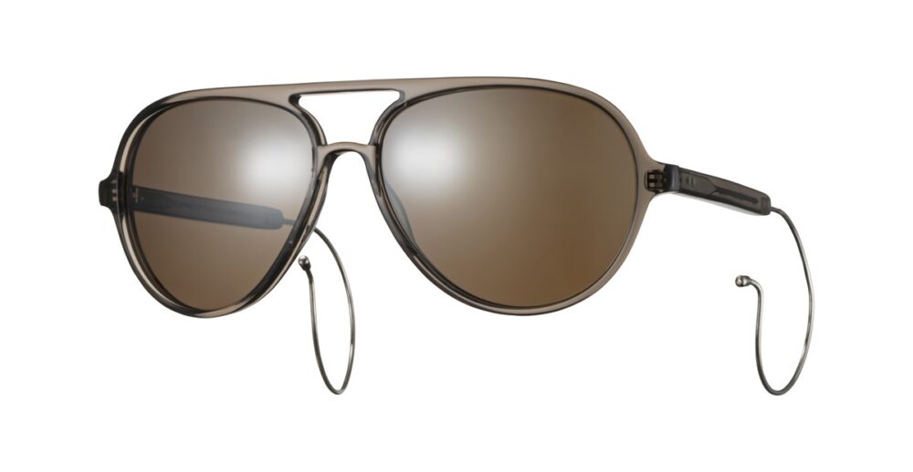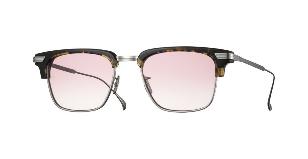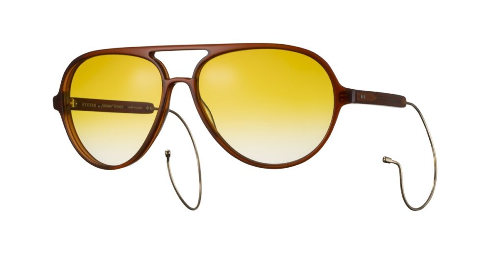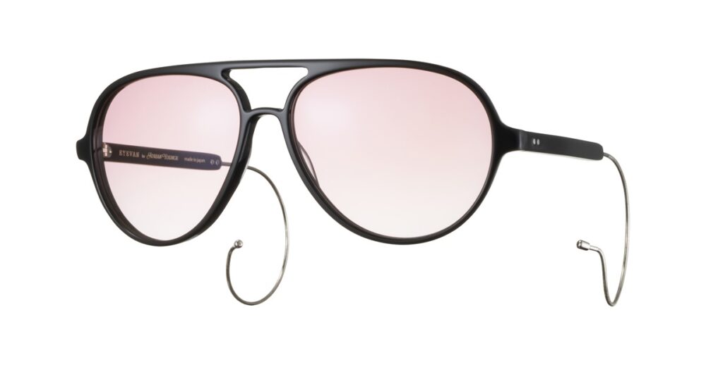 エイドリアン・ヤング所有の1970年代ヴィンテージ・アビエータースタイルをベースに、1950年代のSAFETY GLASSに見られるケーブルテンプルのディテールを融合。フロントのカーブ設計や、正面からもテンプル先端が覗く長さ・角度調整など、細部までこだわり抜いたデザインである。クラシックな要素を継承しつつ、現代的なバランスへと昇華している。レンズにはCHAMPAGNE PINK、DARK YELLOWのハーフカラーに加え、ミラーコーティングのブラウンを採用し、素材には高い透明度と耐久性を誇るCR-39を使用している。