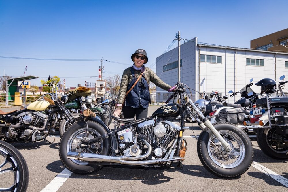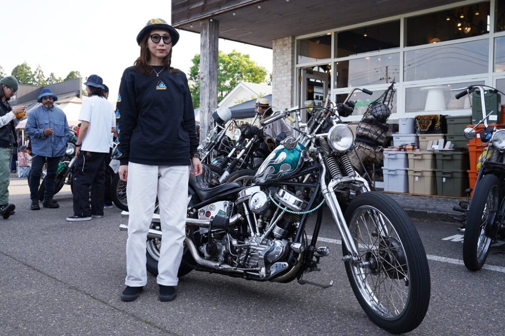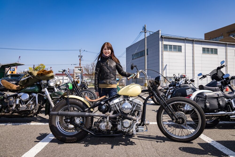 ストレッチフレームのショベルチョッパーを愛機とする女性オーナー、まいさんは、ラングリッツの高機能コーチジャケットを愛用。機能とスタイルを兼ねる万能コーデ。自在にチョッパーを操るライディングスタイルもクールだ。