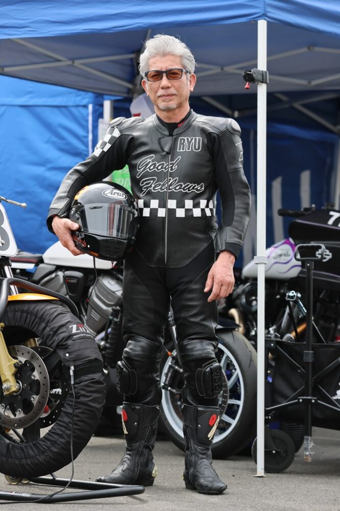 群馬県前橋市でジーンズショップ「NEAT STYLE」を営む角田さん。旧い物へのリスペクトを込めてレースにチャレンジするため、1942年式サイドバルブを手に入れたそう。私服は自社でオリジナル製作したデニム「極みWW2モデル」で、愛車の年代と雰囲気を合わせた。「とにかく黒×黄が好き(笑)」だそうで、ブラックレザーと黄色のTシャツを組み合わせている。