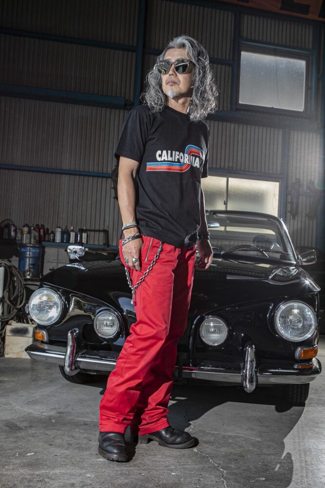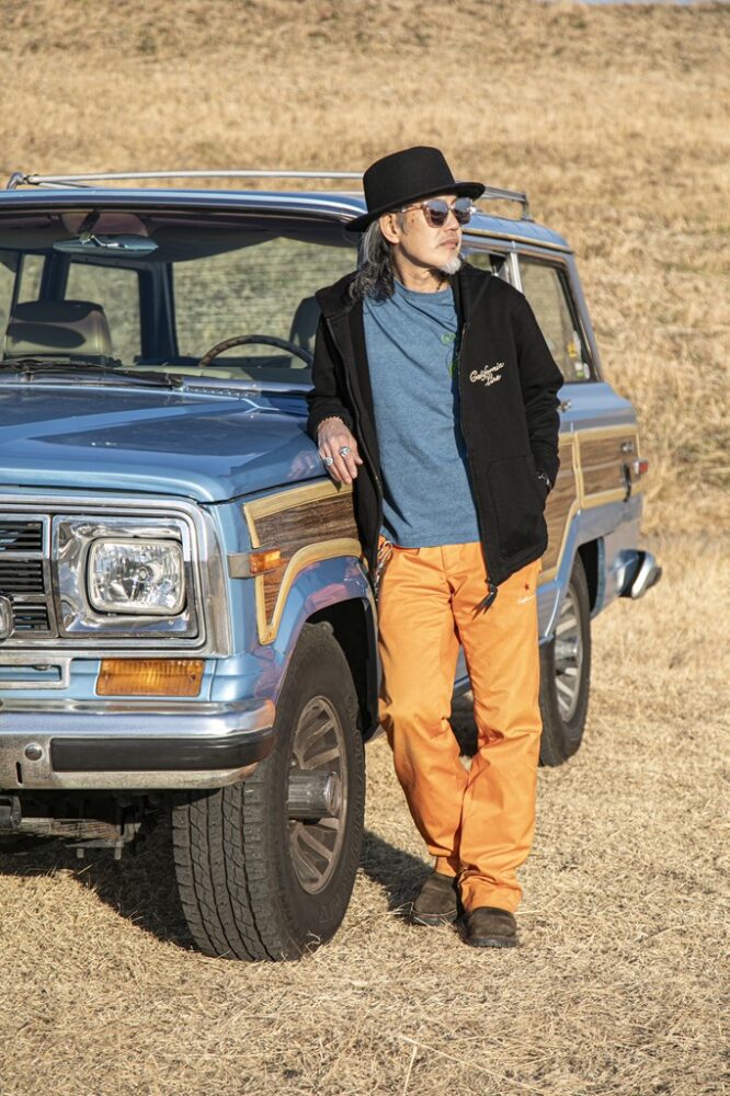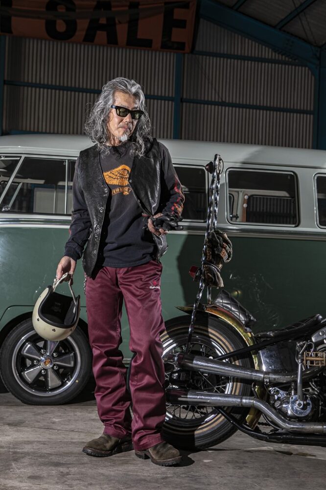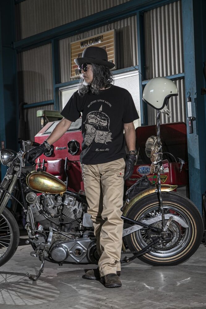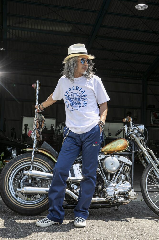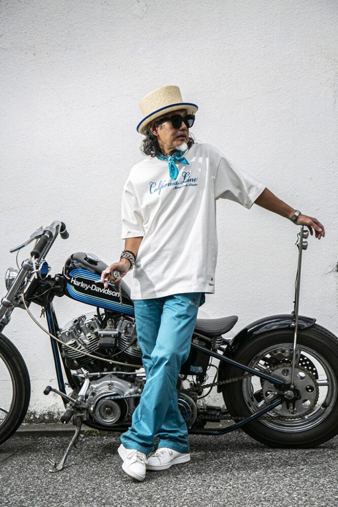 明るいカラーリングでも、ハーレー乗りらしさを演出したいなら、ブラックを合わせることがポイント。明るめのトーンでもブラックのアイテムを入れることで、全体がグッと締まるからだ。ブラックの代用としてネイビーを合わせても、うまく季節感を出しつつ、無骨な雰囲気を出せるのでオススメ。またTシャツのプリントとボトムのカラーを合わせた小技にも注目したいところ。そうすることで全体に統一感が出て、派手な色をまとめてくれるのだ。フリーライドのアイテムでカッコよく決めてもらった。