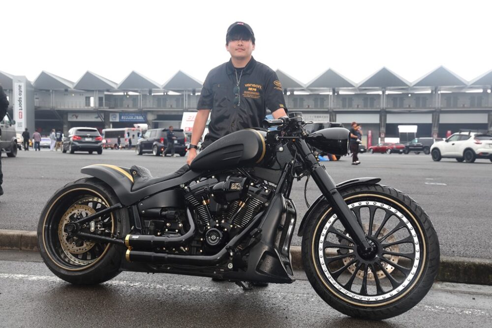 ダイナのベーシックモデルであるストリートボブにフルゲイン製RTカウルを装着したスピードクルーザー。グライド製ホイールにTBR製マフラー、ハンドルとシートはシリアスプライド製とフルカスタム。黒と金のグラデーション塗装に合わせて、各部にゴールドのパーツをあしらった。