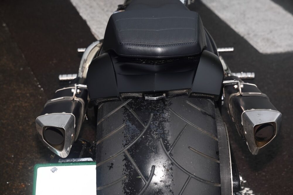 ヘッドライトからタンク、そしてリアフェンダーへとつながるラインが美しいユーロスタイルにカスタム。フロントの径21インチのバッドランド製ホイール、そしてバンス&ハインズ製マフラーのエンドチップなど、黒一色ながらグロスとマットのツートーンにゴールのアクセントが利いたセンスのいい一台だ。