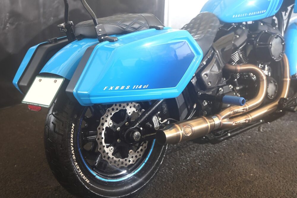 ベーシックモデルともいえるストリートボブを「プライズバイクサロン」がスピードクルーザーにカスタム。純正のグラフィックをベースに鮮やかなブルーにペイント。プライズの定番、フルゲイン製RTカウルにトミー&サンズ製のサドルバッグをハイマウント。マフラー、エアクリーナーはHPI製だ。
