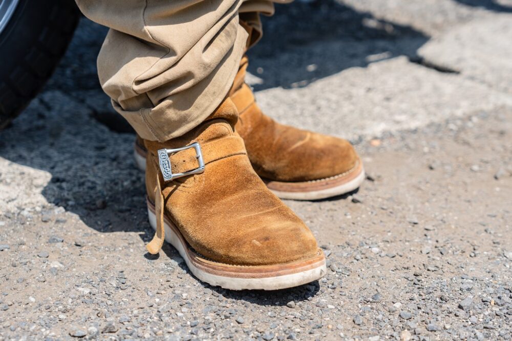 パンショベルのサバイバーで参加した木原さん。刺し子のシャツはシップジョン、愛用ブーツはローカットのロメオ。イタリアンホースハイドを採用し、バックステイを白にするなど個性的なカスタムで仕上げられている。