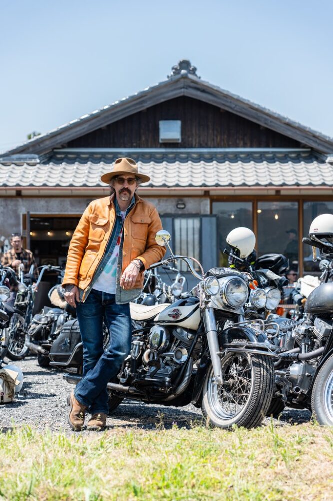 このツーリングの主役といえるシップジョンの代表兼クラフトマン、マイクはデュオグライドで参加。ラングリッツとコラボで製作したウィルスジャケットと同系色のウエスコ・ボスを選んだ、力の抜けたレザースタイル。